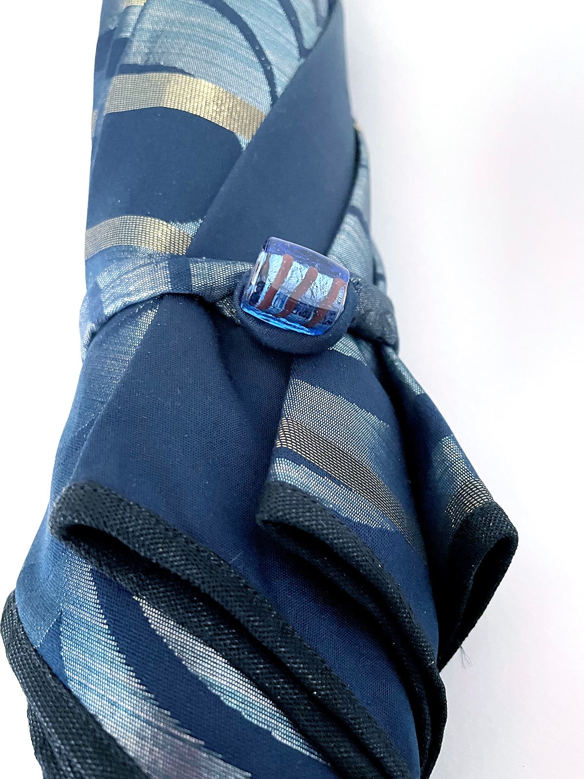 留め具は手作りのガラス玉
