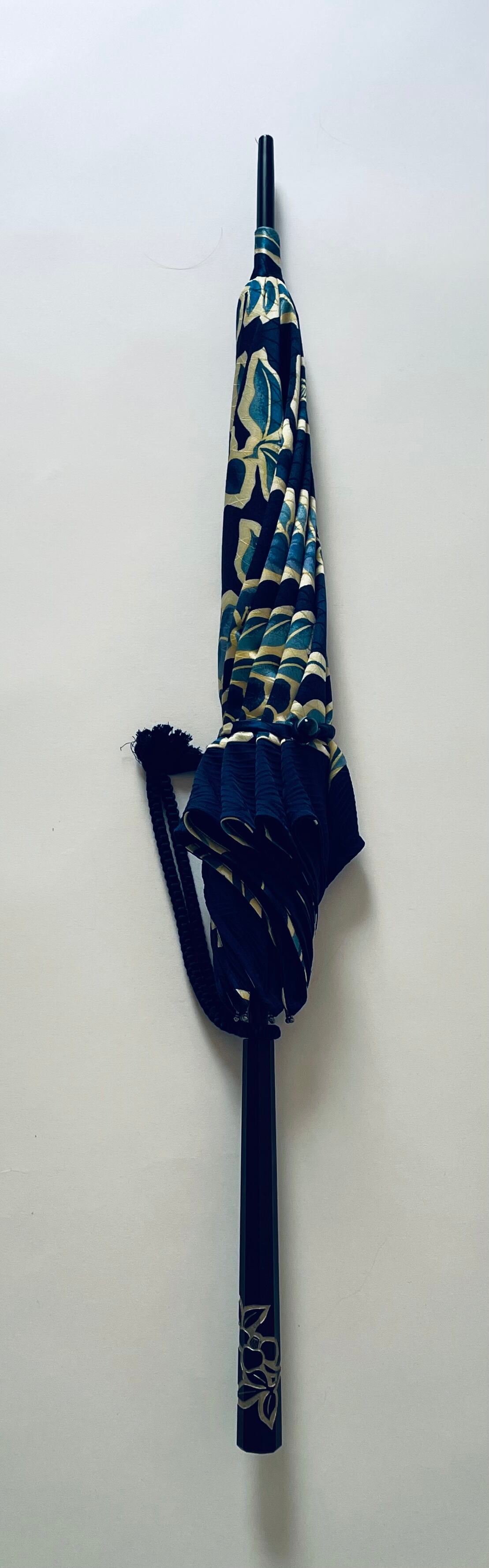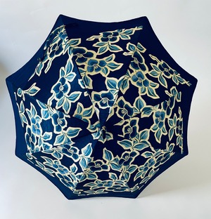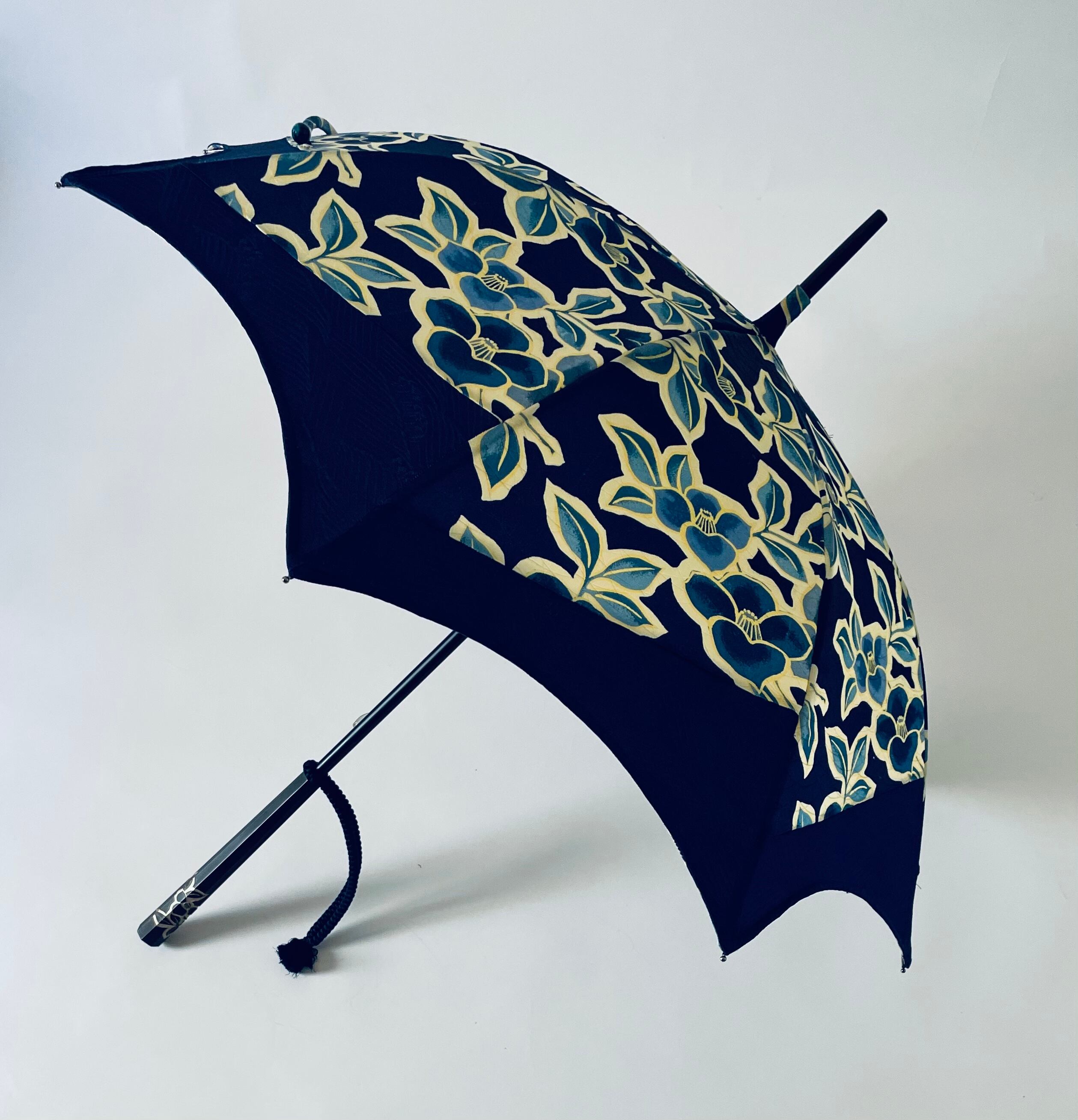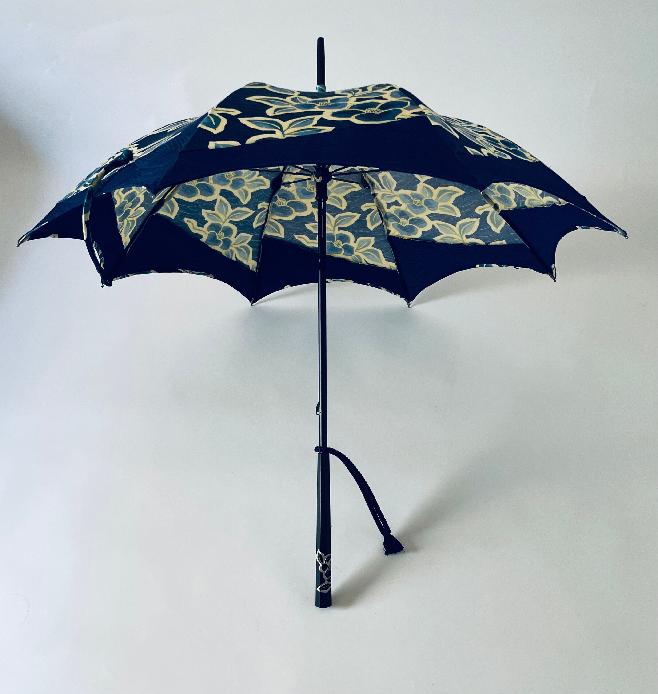 周囲に昭和時代の無地の地模様のある着物で切り替えてアクセントにした日傘